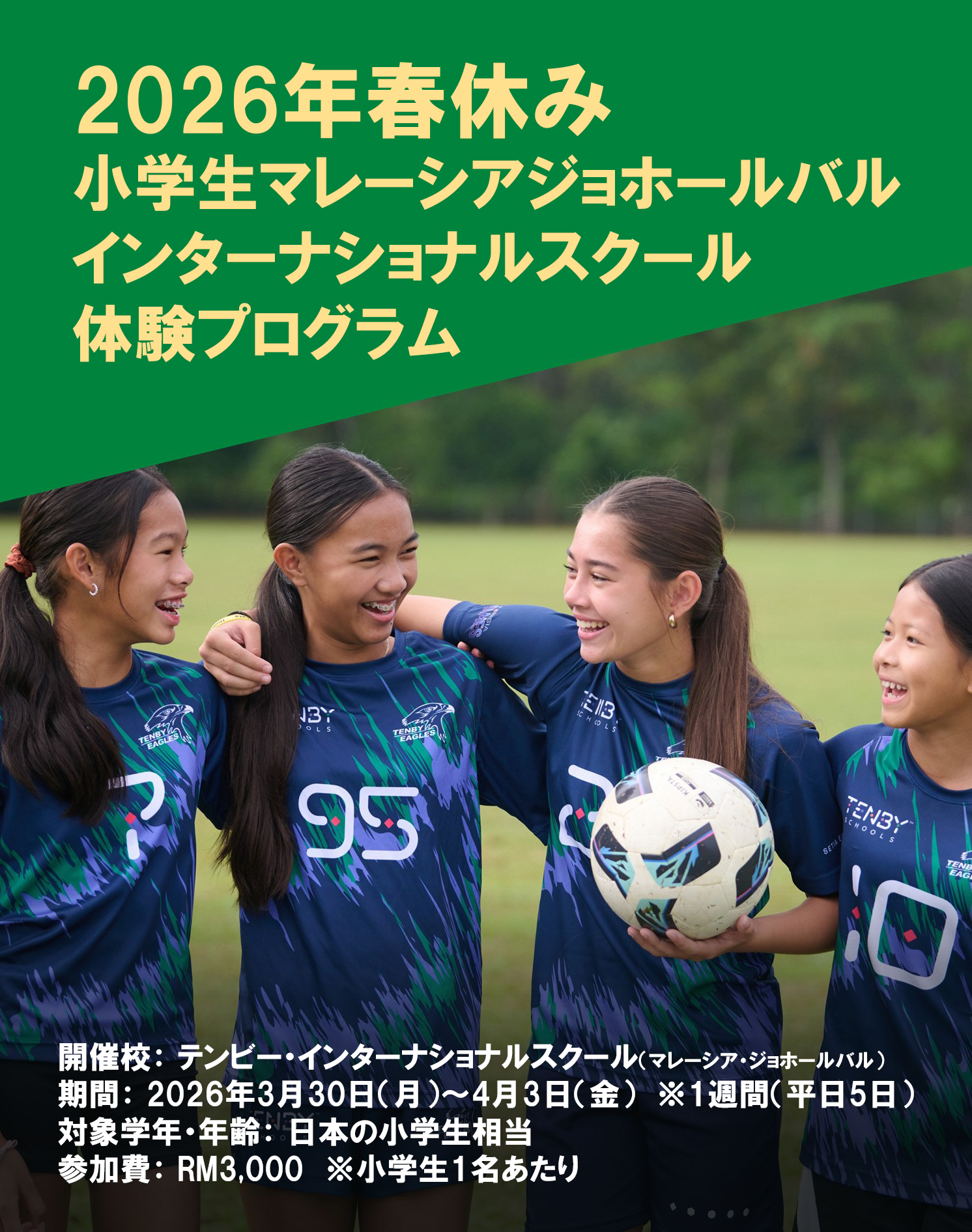 マレーシアジョホールバルにて、テンビー・インターナショナルスクールの協力を得て、小学生のインターナショナルスクールの体験プログラムを開催することになりました。 通常授業とは別の語学学校のようなプログラムではなく、 在校生に交じって『通常のインターナショナルの授業』を体験することが出来ます。 ジョホールバル・インターナショナルスクールを実際に検討されている方はもちろん、 国際教育に興味がある方など、お気軽にお申込みください。 ■開催概要 ・開催校:テンビー・インターナショナルスクール(マレーシア・ジョホールバル) ・期間:2026年3月30日(月)~4月3日(金)※1週間(平日5日) ・対象学年・年齢:日本の小学生相当 ・参加費:RM3,000 ※小学生1名あたり ・開催校:テンビー・インターナショナルスクール(マレーシア・ジョホールバル) https://www.tenby.edu.my/setia-eco-gardens ・本プログラムのチラシ(英語) ・空港送迎ハイヤー、宿泊、スクールバス、テンビー以外のインターナショナルスクールの見学ツアー、子供だけでの参加等、関連プログラムは別途料金となりますので、もしご希望がある場合には、お聞かせください。 尚、マレーシア・ジョホールバル(シンガポール・チャンギ空港)へのフライトはご自身での手配となります。 ■申し込み・お問い合わせ 申し込みURL https://forms.gle/CcxWWnbast9u6NZZ8 お問い合わせURL https://www.property-johor.com/usr/contactus.aspx?pgid=19&lang=ja ■主催会社 JC ASSET MANAGEMENT SDN. BHD. https://property-johor.com/ info@property-johor.com +60 17 773 9634